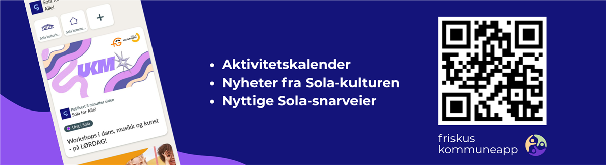 Kalenderen samler det beste som skjer i Sola fra mange ulike arrangører i kommunen, frivillige organisasjoner og næringslivet. Det betyr at du slipper å lete på ulike nettsider for å finne ut hva som skjer – alt er samlet i én kalender. Her er det ingen reklame og algoritmer som fører deg på avveie.