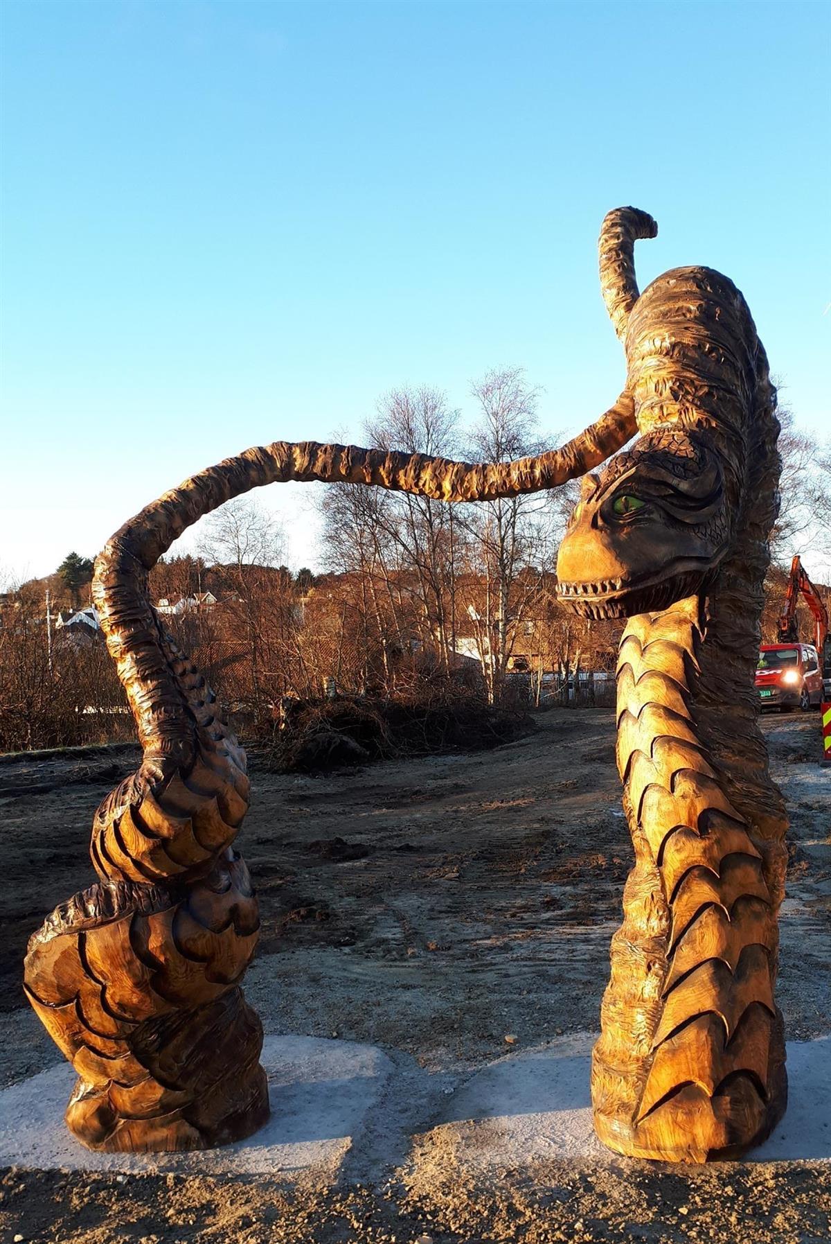 Motorsagkunstner Oliver Vogt har laget inngangsportalen til aktivitetsparken, som forestiller en stor orm. Han har tidligere også laget vikingfamilien ved Ormen Lange.