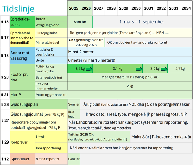 Tabellen nedenfor viser en skjematisk fremstilling av overgangsreglene i forskriften om lagring og bruk av gjødsel. Vær oppmerksom på at «fosfor» i enkelte tilfeller er forkortet til «P» i tabellen. Tabellen er utarbeidet av Statsforvalteren i Rogaland, med mindre justeringer gjort i den opprinnelige grafikken for å øke brukervennligheten.